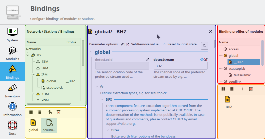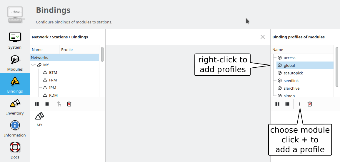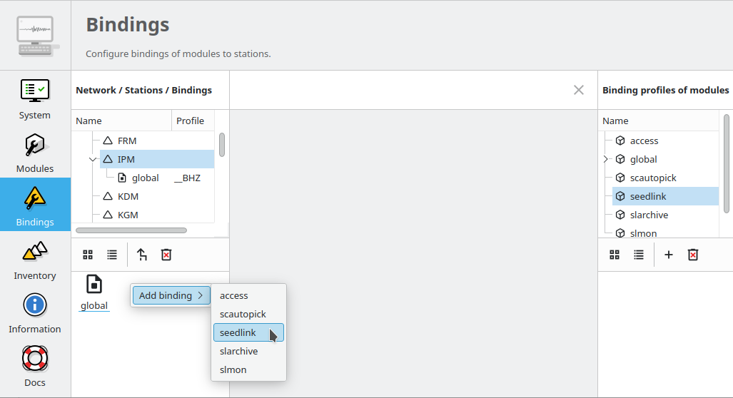 The binding panel configures a station for a module providing station-specific configuration such as data acquisition or processing. Read section Bindings configuration for details on bindings configuration.