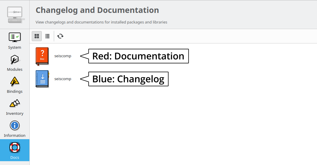 Access the documentation and the changelog of any installed package from the Docs panel. Double-click on the red or blue button to open the documentation or the changelog, respectively.