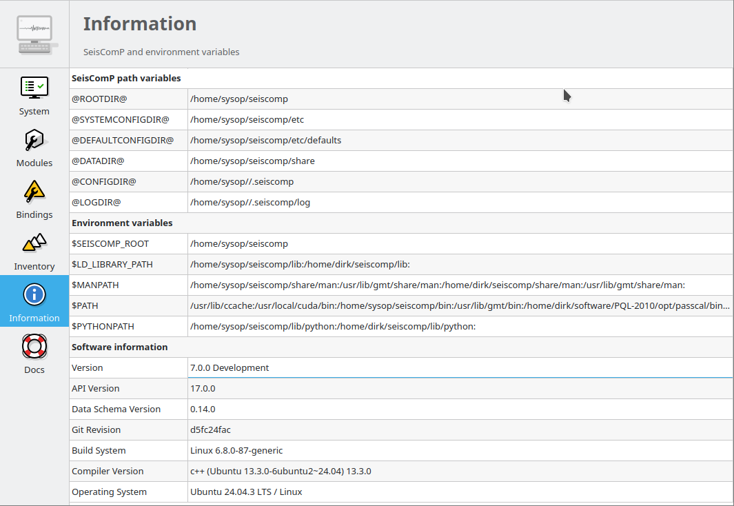 This panel shows information about the SeisComP environment including system variables and the SeisComP variable related to the currently executed instance of scconfig.