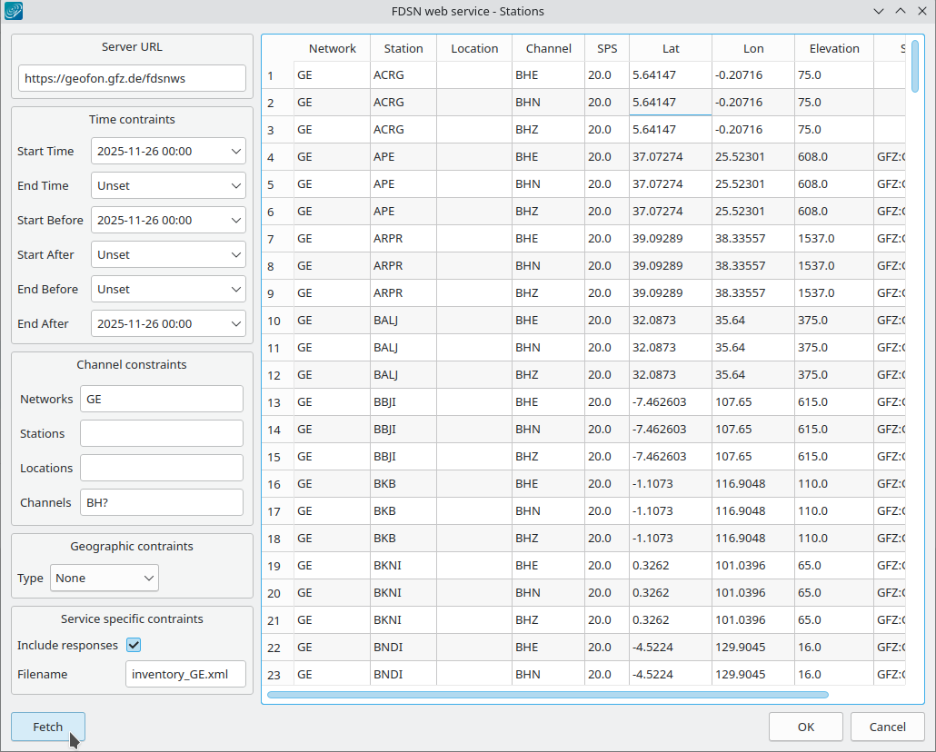 Import inventory: After fetching from FDSN server and before integration the stream list can be inspected.¶