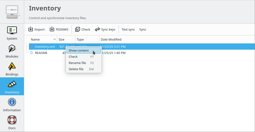 After closing the popup, the imported inventory file will show up in the list of files. Right-clicking a file allows: