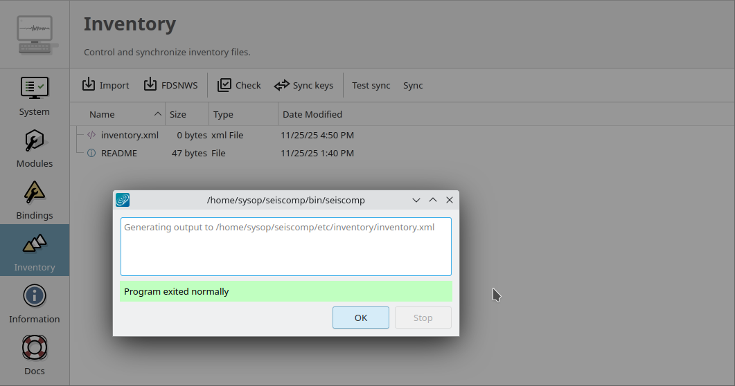 The inventory XML files are not used directly with SeisComP. They need to be synchronized with the database first (see Station meta data). Synchronization needs to merge all existing XML files and create differences against the existing database tables. While merging conflicts can occur such as duplicate stations with different content (e.g. different description). This action is a dry-run of the actual synchronization. It performs merging and creates differences but does not send any update. This actions is useful to test all your existing inventory files before actually modifying the database.