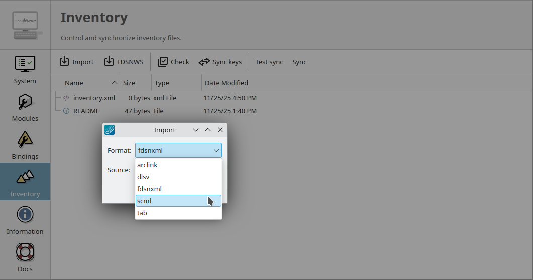 External inventory files can be imported by pressing the Import button in the toolbar on the top. Pressing the button will open a popup allowing to select for input format.