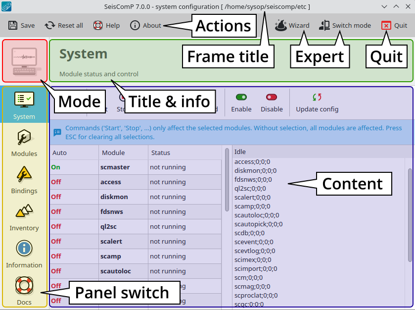 Main window of scconfig: frame title, action buttons, mode indicator (red), panel selection (yellow), panel title and information (green), panel content (blue).¶