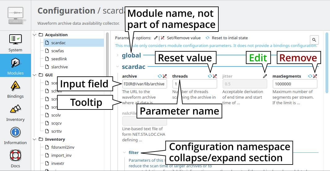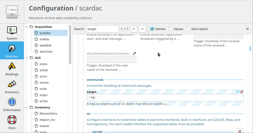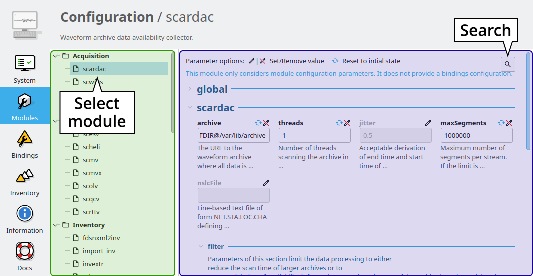 Create and adjust the configuration of modules and bindings for all configurable SeisComP modules including all trunk and standalone modules,