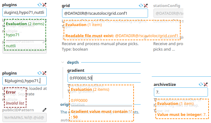 The value in the edit widget will show the currently configured value in the active configuration file but the tooltip will show the evaluated value, the location of the definition and a warning.