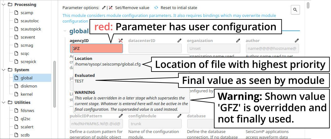$HOME/.seiscomp/<module>.cfg. Parameter values set in user mode override system-mode configurations.
