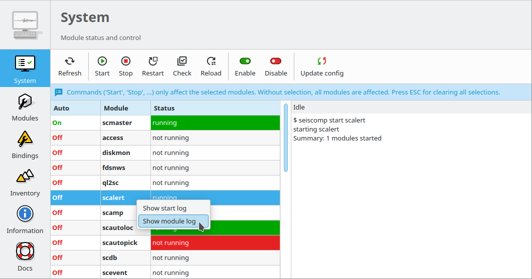 The toolbar gives access to the available operations. All operations will affect the currently selected modules (rows). If no row is selected, all modules are affected and the corresponding call to seiscomp <arg> is done without any module. Also read the documentation of seiscomp for more details.