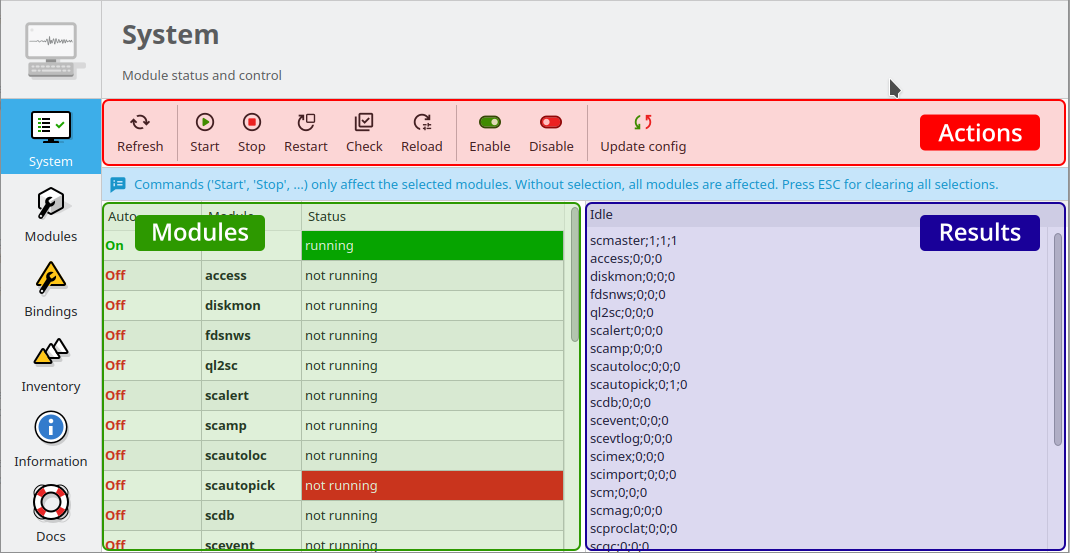 scconfig is a graphical user interface which allows toControl modules (start/stop/check/enable/disable) and access logging file,