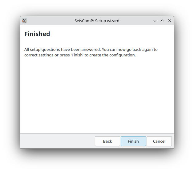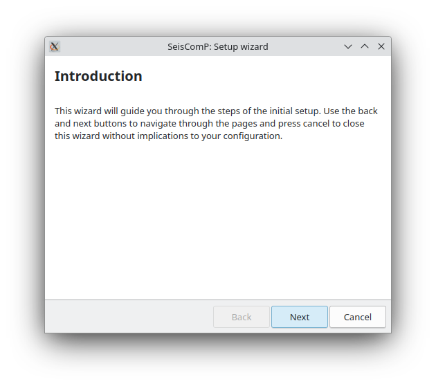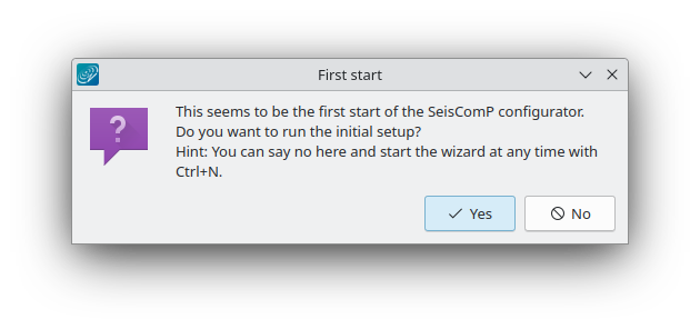 If you wish to run the setup, continue by pressing Yes. The wizard will be started and will configure exactly the same parameters as described in Getting Started with SeisComP.