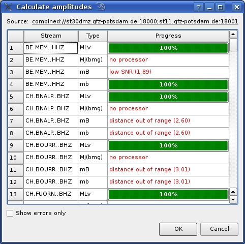 When an event is relocated new magnitudes can be calculated by using the “Compute Magnitudes” button in the “Location” tab. The advantage of calculating the magnitudes before commiting the new origin is the possibility to check the resulting magnitudes before they are published to the system. A window will appear giving the progress information of computation which will be confirmed by “ok”.