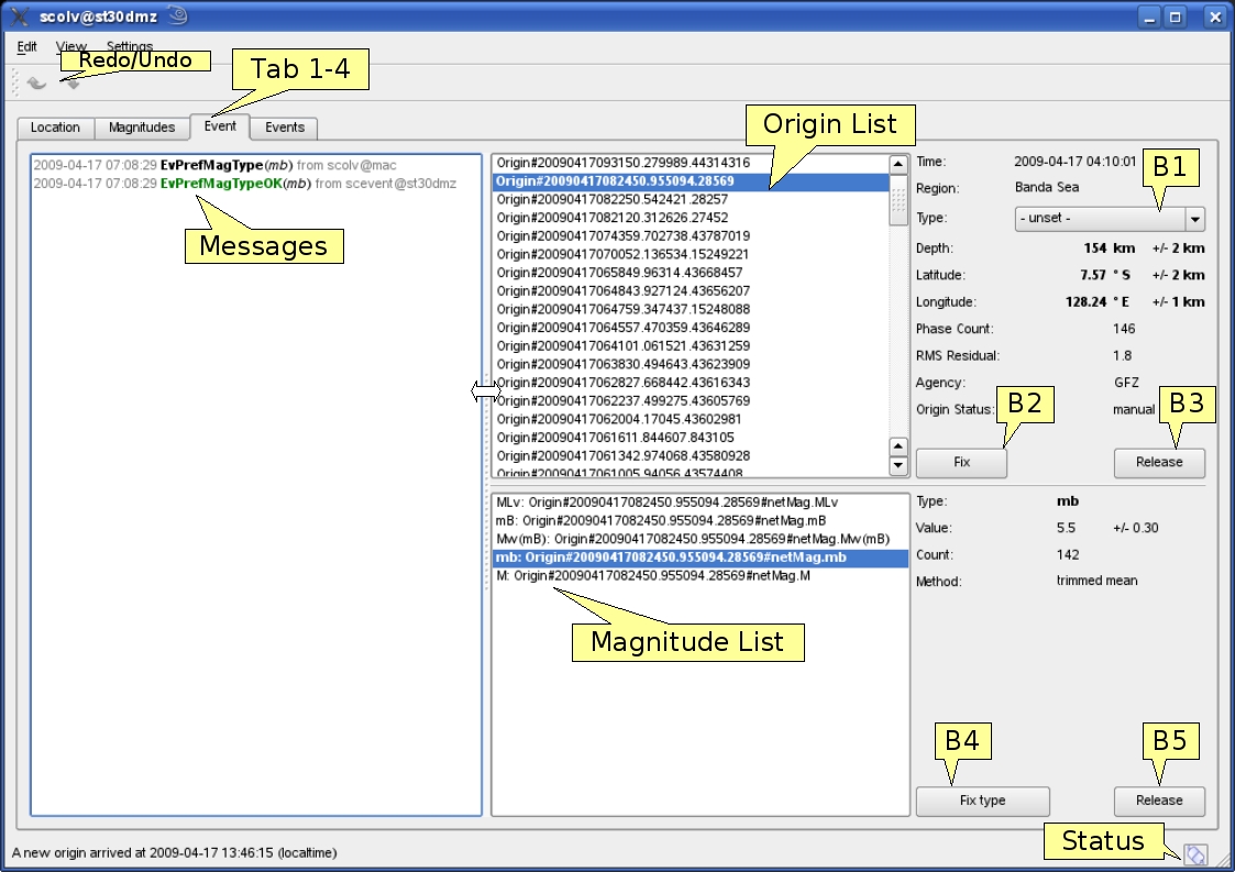 Figure 5‑15: Event tab of scolv. Origin List = list of all associated origins; Magnitude List = list of magnitudes of the actual origin; Messages = messages to scevent, visual after pulling the left frame to the right; B1 = Selector for the event type; B2 = button to fix the selected origin as preferred; B3 = button to let scevent select the preferred origin; B4 = button to fix the selected magnitude as preferred; B5 = button to let scevent select the preferred magnitude.