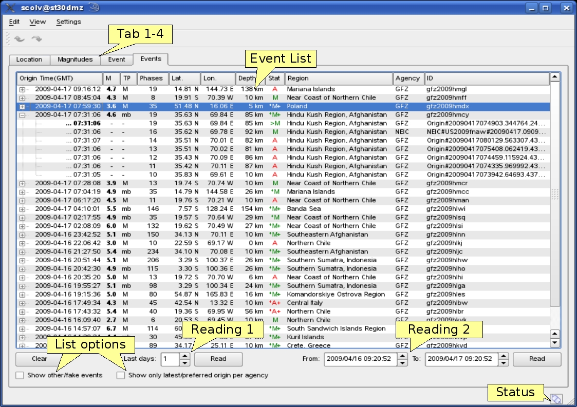 Figure 5‑16: Events tab of scolv. Event list = summary of events with status information that consist on the review status (automatic, manual or confirmed), the publish status (star) - the published origin is marked with > and imported origins from other institutes (+) that are identified by different agency IDs; Reading1 = Load events of the last days; Reading2 = Load events for specific timespan; List options = Show fake events and show only preferred/last origin per agency; Status = Connection status.