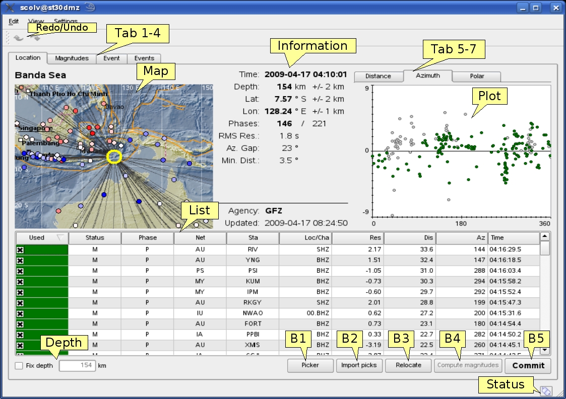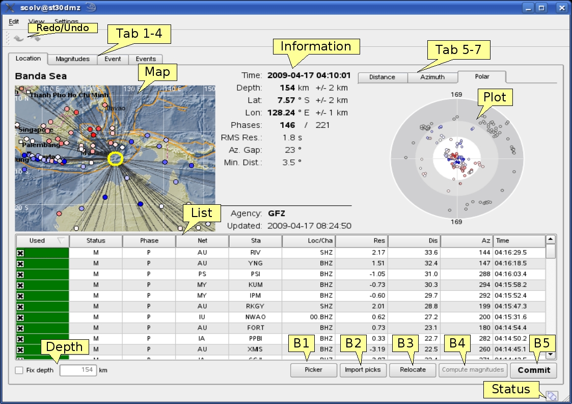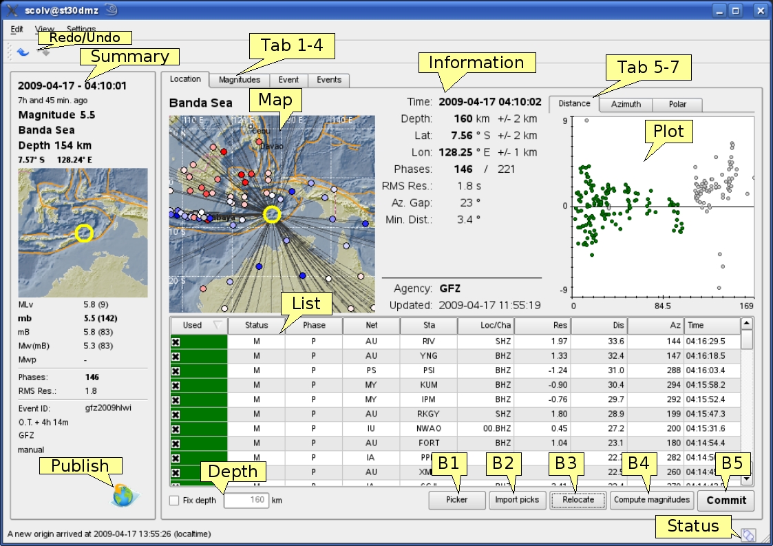 Figure 5-10: Location tab of the scolv. Redo/Undo = Switch to last/next location result; Tab1-4 = Location/Magnitude/Event/Events tab; Map = map with the event location, associated stations, the residuals (color-coded: red-positive, blue-negative) and ray paths; Information = Origin information including time, epicentre, depth, number of used and available phases, RMS, azimuthal gap and minimum station distance; List = Table of associated arrivals (phases) containing stream information and phase information; Tab 5-7 = Arrival residual plots against distance and azimuth (linear and polar) in a separate tab; Plot = Arrival residual plot (distance over residual in seconds); Depth = Checkbox to fix to a defined depth; B1 = Open Manual Picker; B2 = Import picks of other automatic origins belonging to the same event; B3 = Relocate with the given arrival information; B4 = Compute magnitudes; B5 = Commit origin; Status = Connection status; Summary = all information of the preferred origin of the actual event; Publish = Button to publish the event (s Figure 4-19).