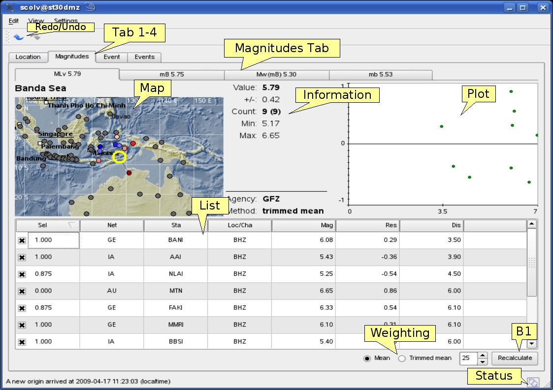 scolv is the main interactive tool to revise or review the origin information like picks, location, depth and time and magnitudes. Therefore scolv is divided in 4 logical units: