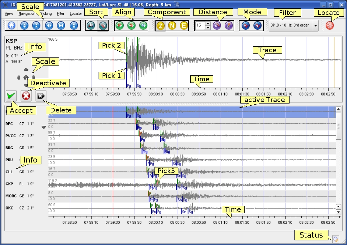 Figure 5‑17: Manual Picker of scolv. Scale = Time and amplitude scaling of the trace overview and/or the zoomed trace; Sort = Sorting of traces by residual or distance; Align = Aligning traces by P- or S-phase or by origin time; Component = Selection of Z-, N- or E-component; Distance = Loading all stations in a defined distance range and toggle display of all traces or only active traces; Mode = Choose picking mode; Filter = Selector of predefined filters, Locate = Button to relocate with the actual picks; Info = Stream information of the zoomed trace; Accept = accept a pick; Deactivate = De-/Reactivating an active or deactivated pick; Delete = Deleting the actual manual pick; Pick1 = theoretical; Pick2 = manual pick (green); Pick3 = arrival unassociated automatic pick (light red), associated picks (dark red); Time = time scale (absolute in origin time alignment, relative in phase alignment); Active trace = Selected trace shown in zoom window; Status = connection status.