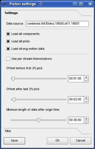 The Manual Picker can be configured by the dialog shown in Figure 5-18. The dialog allows changing the waveform data source. To tune performance it is possible to reduce the waveform time window, to load only the Z-components instead of the Z-, N- and E-components and to exclude the strong motion data. The settings dialog also enables to define individual filters.