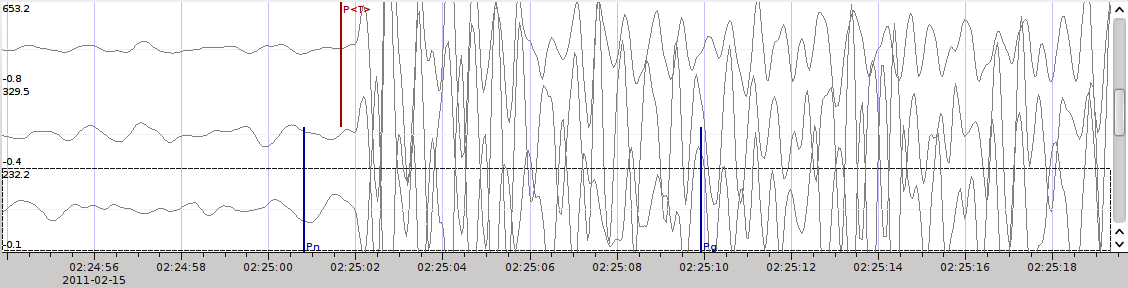 The initial view loads all traces of all arrivals within the defined distance for that magnitude type. The zoom trace shows all components required for this particular amplitude type and the lower part shows all stations and only the currently active component. All traces are aligned on trigger time (blue P marker). If a station has got an amplitude it shows up as a red (automatic determined amplitude) or green (manually determined amplitude) marker. This display is similar to the Picker.