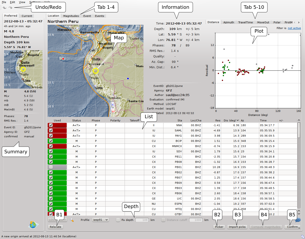 The Location tab shows detailed information of the associated phases and the residuals from the chosen origin additional information about the hypocenter, time, station distribution, helps to find outlier.