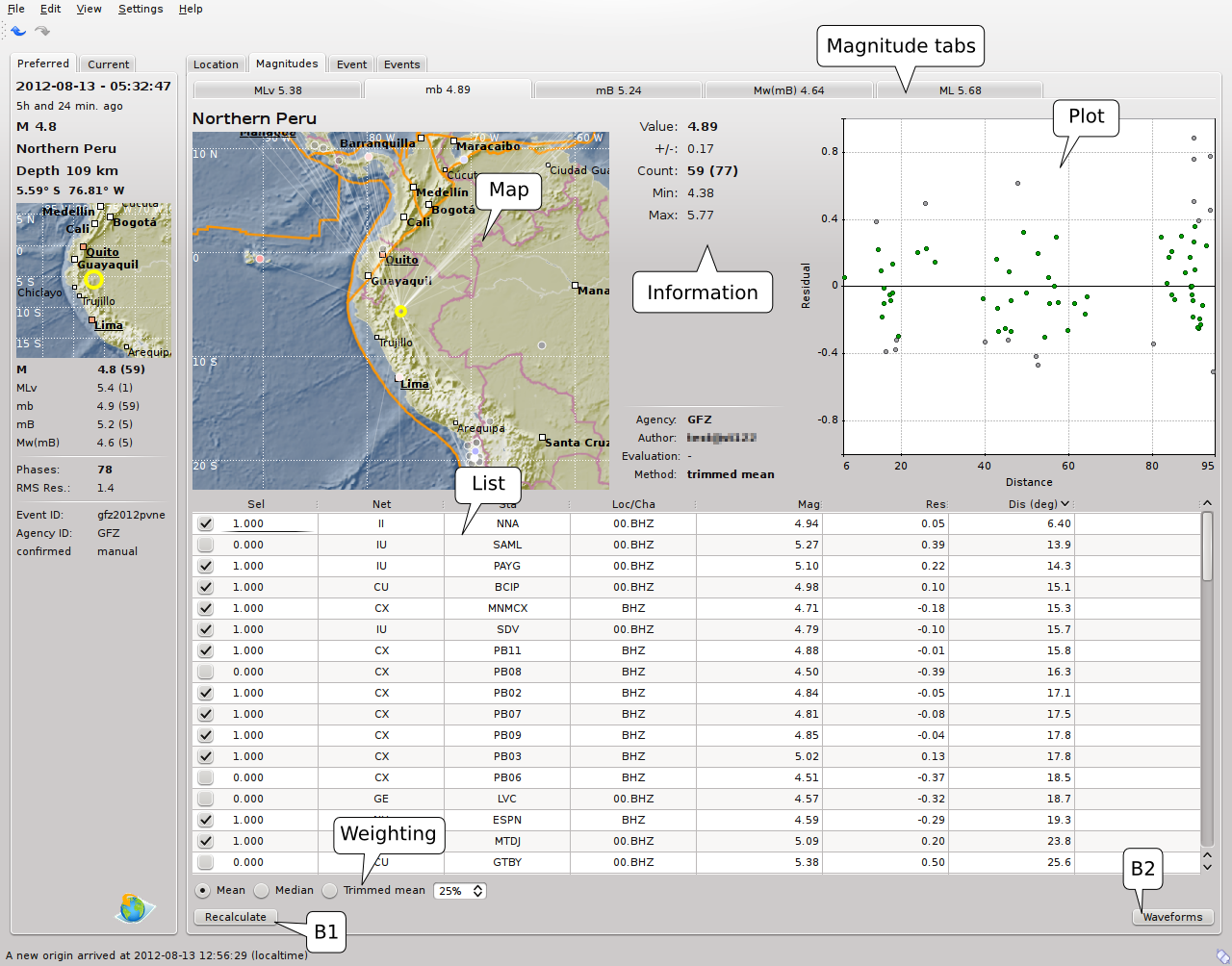 The Magnitude tab shows all available magnitude information for the chosen origin. For each of the different magnitude types (e.g. mb, mB, MLv, Mw(mB)) the station magnitudes are shown in the magnitude residual plot and the table. The residual plot visualizes the difference between the station magnitude and the network magnitude for the different station distances. After relocation the magnitude can be recalculated by the "Compute Magnitudes" button in the Location tab. Station magnitudes can be deselected for computation. Normally, the 25%-trimmed mean is calculated as network magnitude to stabilize the result against a few outliers.
