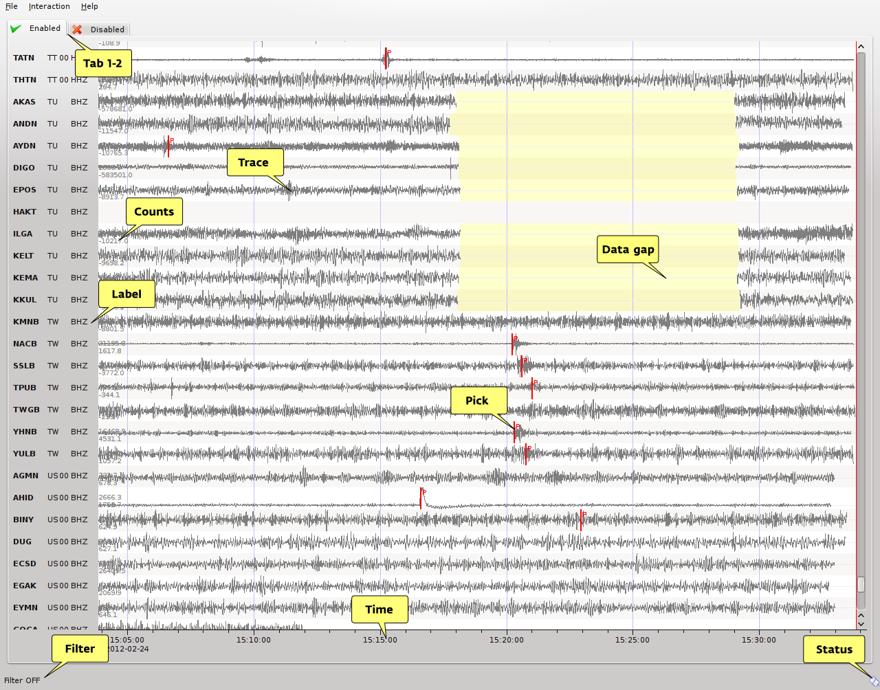scrttv shows two tabs: the enabled and the disabled tab (see scrttv overview: Tab 1-2). Stations listed in the disabled tab are excluded from processing (e.g. picking). To move a station from one tab to another just drag and drop the trace to the new tab. An alternative solution is to double click on the trace label to disable a trace.