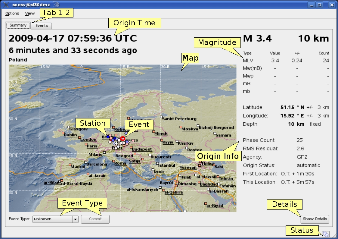 Tab1-2: Summary/Events tab, Origin Time: origin time in UTC and relative to now, Map: map with region and location and stations, Magnitude: different magnitude types with values and counts, Origin Info: hypocenter information with position, phase count and azimuthal gap, Event: earthquake location, Station: station with ray-path, Details: "Show Details" button to open detailed information in scolv, Event Type: event type combo box to set event type, Status: connection status