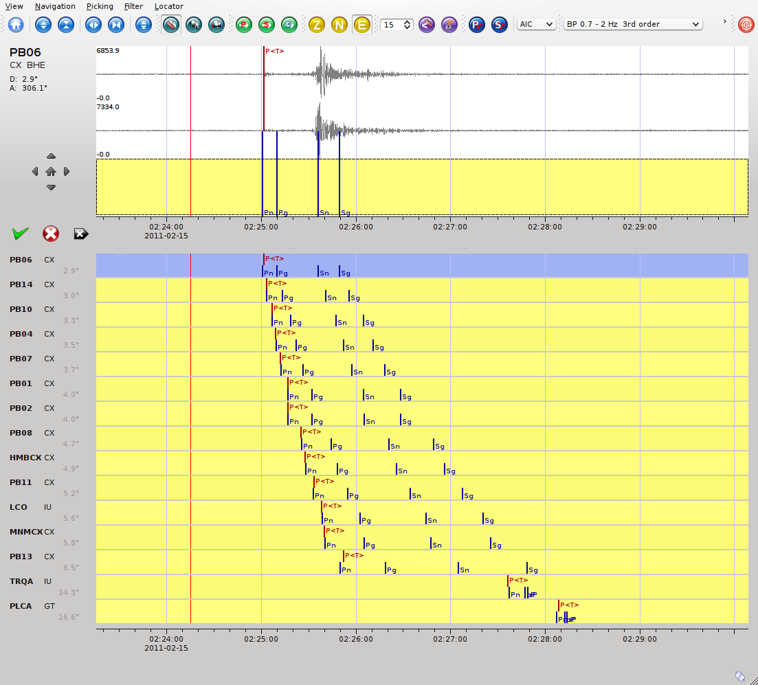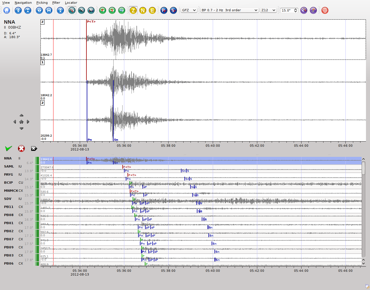The Picker button opens the interactive waveform picker window. It allows to pick additional phases, to confirm picks, to add additional pick information such as polarity and uncertainty, to rotate traces and much more.