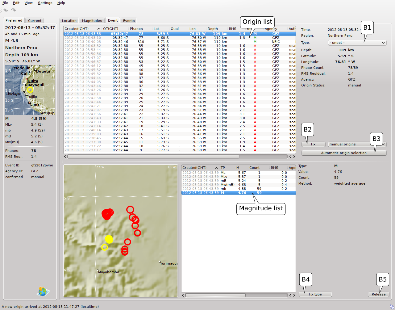 scolv is the main interactive tool to revise or review the origin information like picks, location, depth, time, magnitudes and event association. Therefore scolv is divided in 5 logical units (tabs):